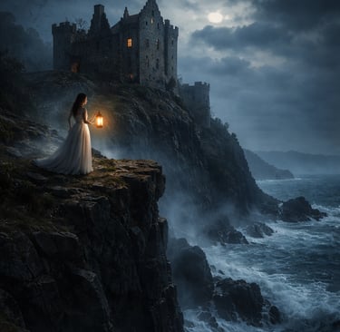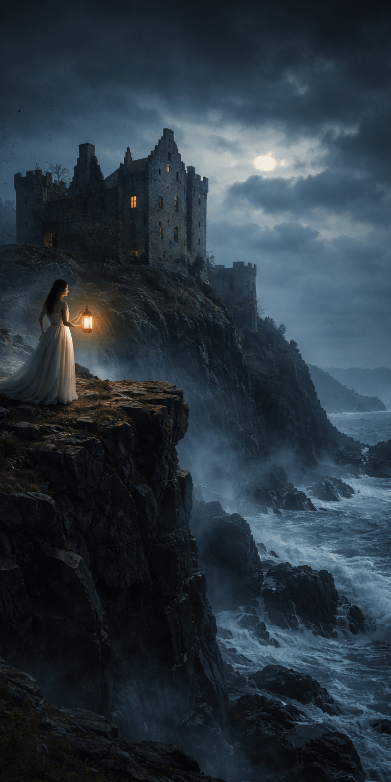 Days passed with no sign of the vessel. Refusing to accept the loss, the woman began climbing the cliffs each evening, carrying a lantern to the edge of the headland. She believed that if her lover’s ship survived the storm, the light would guide him safely back toward the shore. Night after night she stood above the sea, the wind pulling at her cloak while the lantern flickered against the darkness.