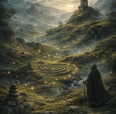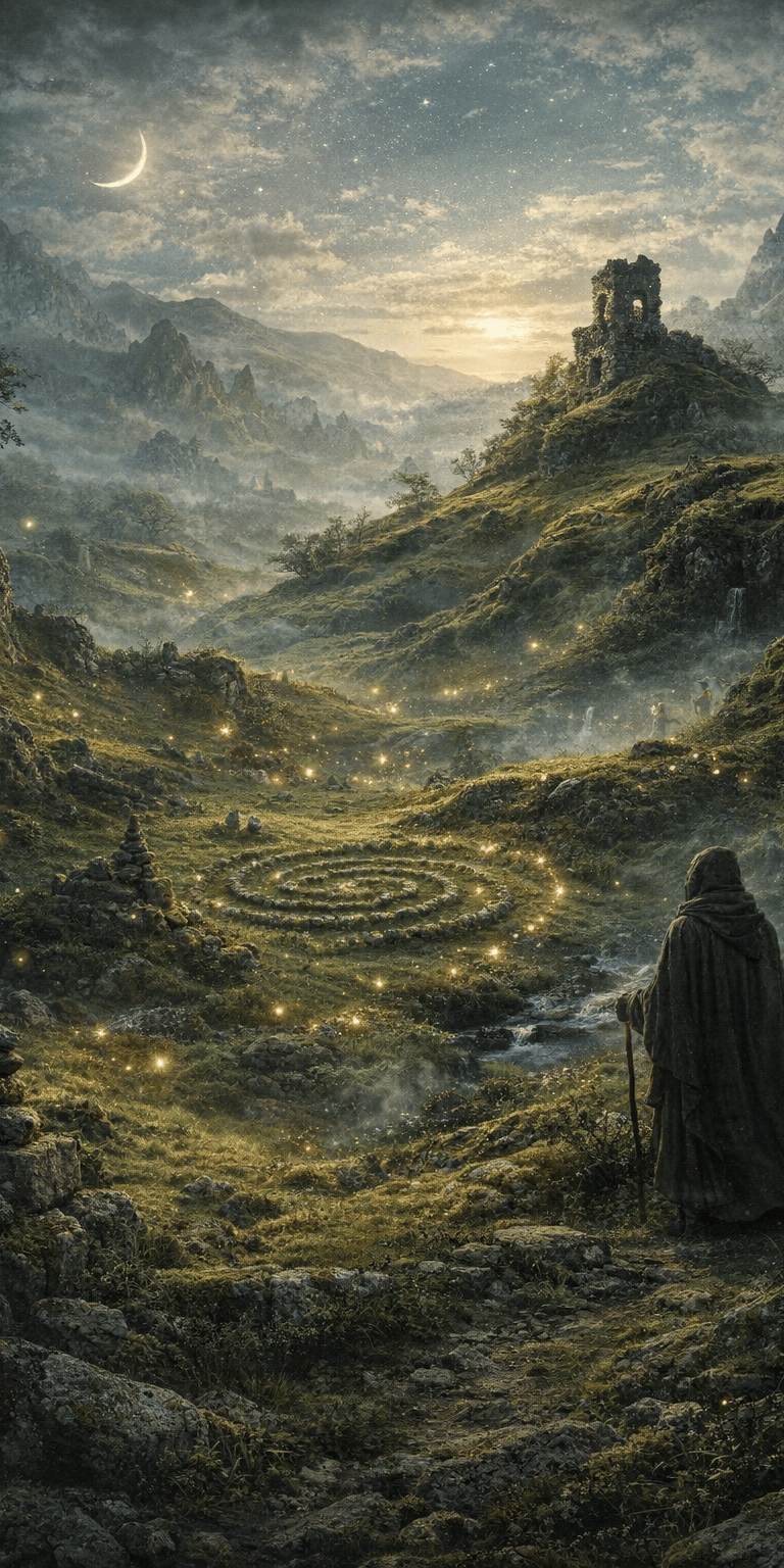 One enduring tale tells of a traveller who crossed the glen at dusk and noticed a procession of small lights moving in a slow circle near the base of the tallest hill. Believing them to be lanterns, he approached — only to find the lights retreating silently as he drew near. The air grew unnaturally still, and the sound of his own footsteps seemed swallowed by the earth. When he finally turned away, the lights vanished, and the valley returned to its ordinary quiet.